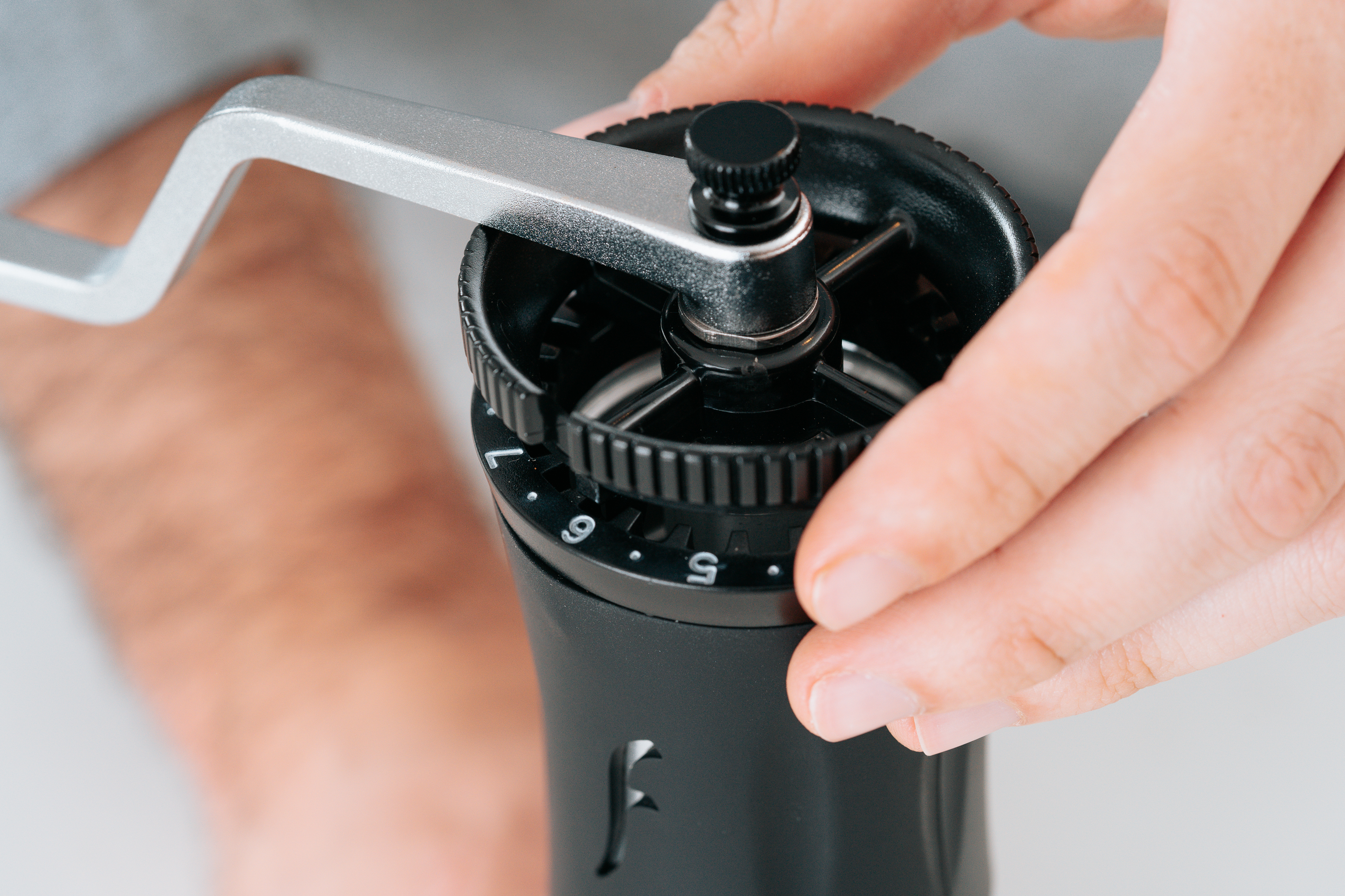 El único molinillo de mano de Flair Espresso, ahora con muelas que muelen el doble de rápido, un reposamanos para una mejor tracción y torque, y un anillo retenedor de acero inoxidable.